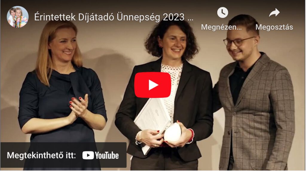 2023. november 26-án tartottuk meg a VI. Érintettek Díjátadó ünnepséget, ahol nagy örömmel fejeztük ki hálánkat három különleges gyógyítónak, Kovács Emesének, Dr. Kovács Gábornak és különdíjasunknak, Némethné Tóth Szilviának.