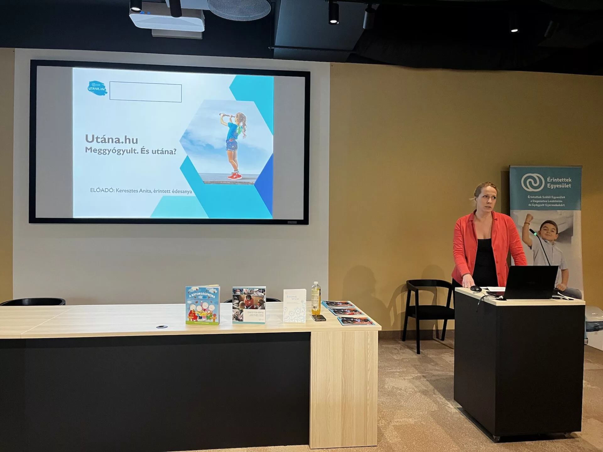 Ezt követően Keresztes Anita, aki érintett édesanya és egyben az egyesület alelnöke, osztotta meg személyes tapasztalatait az utánkövetés fontosságáról, bemutatva az utána.hu weboldalt és a „Vissza a jövőbe!” kiadványt.