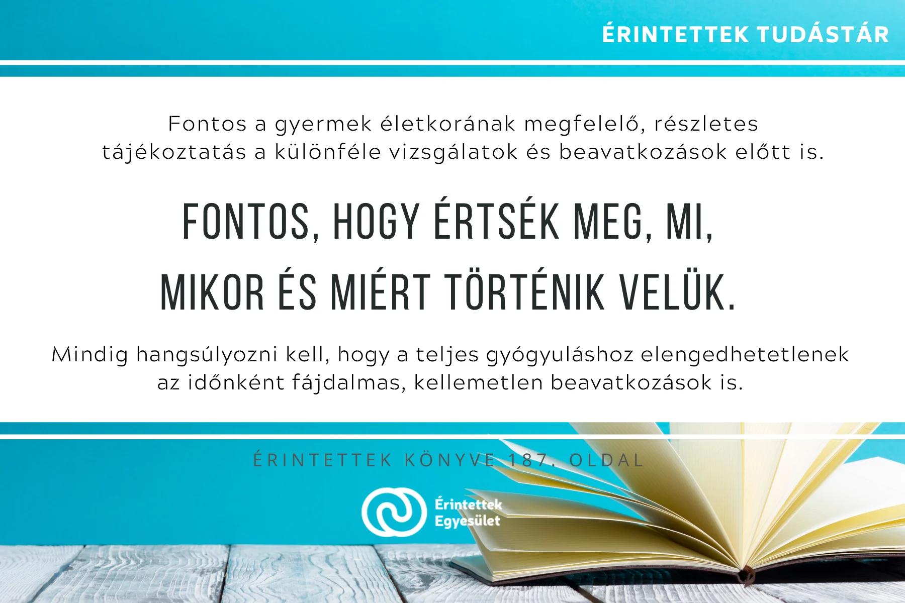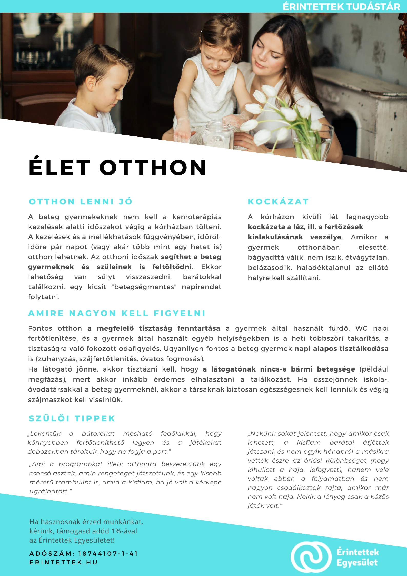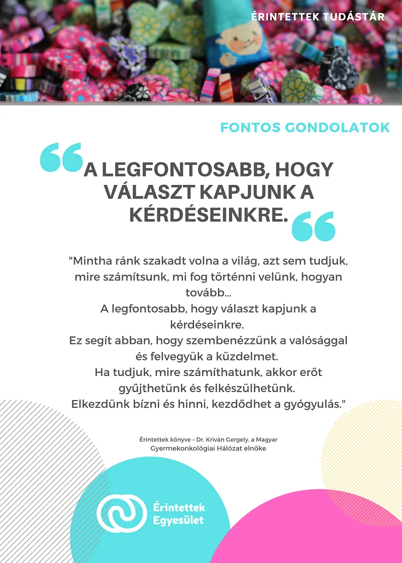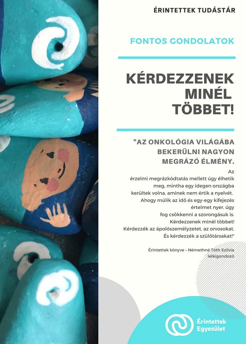 Az Érintettek Tudástár infosorozatot elsősorban a daganatos és leukémiás gyerekek családjának készítettük, de mindenkinek hasznos lehet, aki szeretné hiteles forrásból, összefoglalva, könnyen érthetően megismerni a kezeléseket, vizsgálatokat és szívesen kapna hasznos tippeket a nehéz helyzetekre.